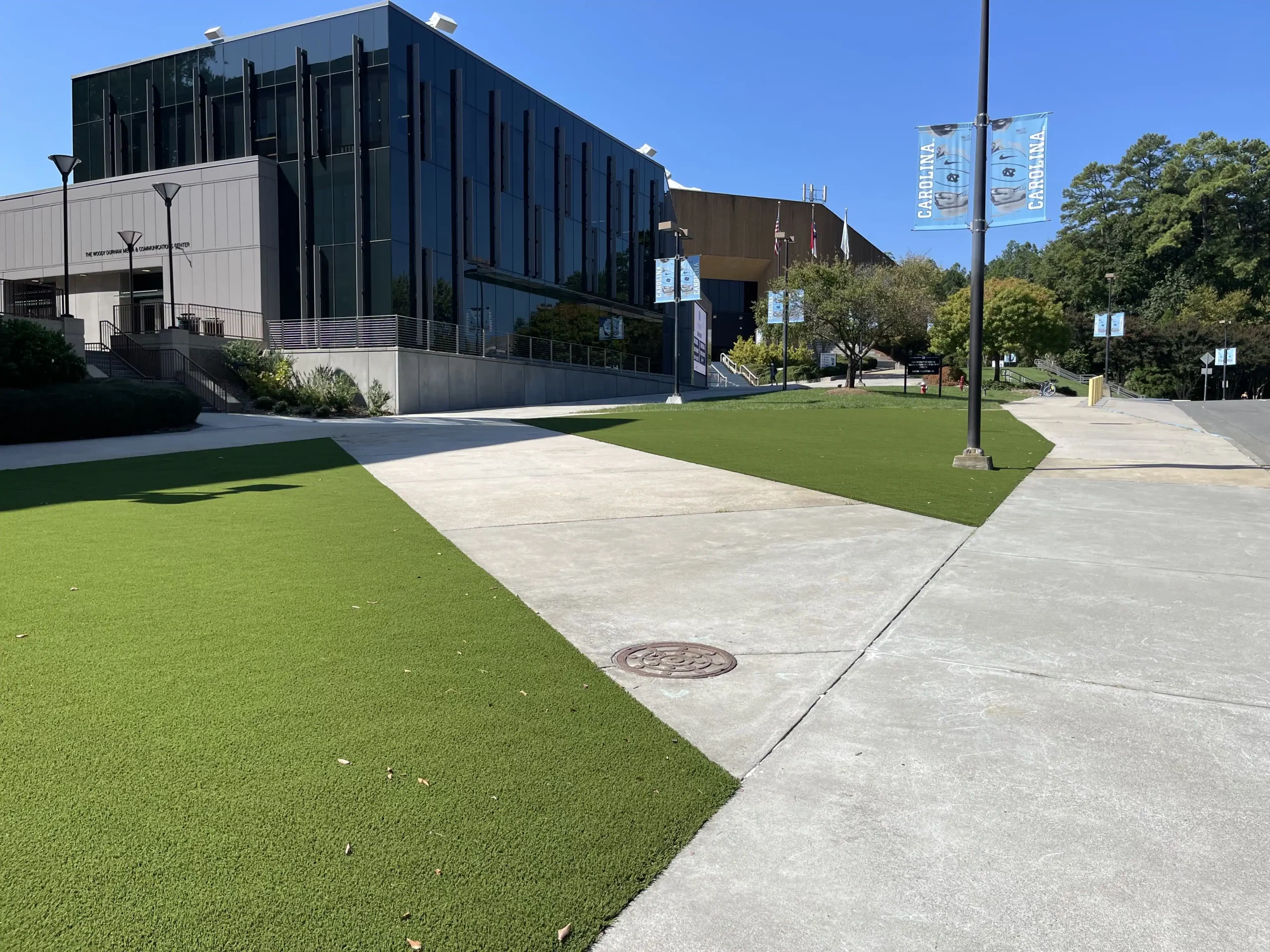 Arguably one of the most popular collegiate basketball programs in the world, UNC Chapel Hill’s Dean E Smith Center is the home to the UNC Chapel Hill Men’s Basketball Team. Outside of this iconic arena is several grass lawns used for tailgating throughout the year, but most notably during the Men’s Basketball Season. After fighting natural grass for years, UNC Chapel Hill decided to make the switch to artificial grass. One section of the area is built with ABC Stone to allow for showcasing of sponsor vehicles (Mercedes Benz, BMW, Ford) during events.